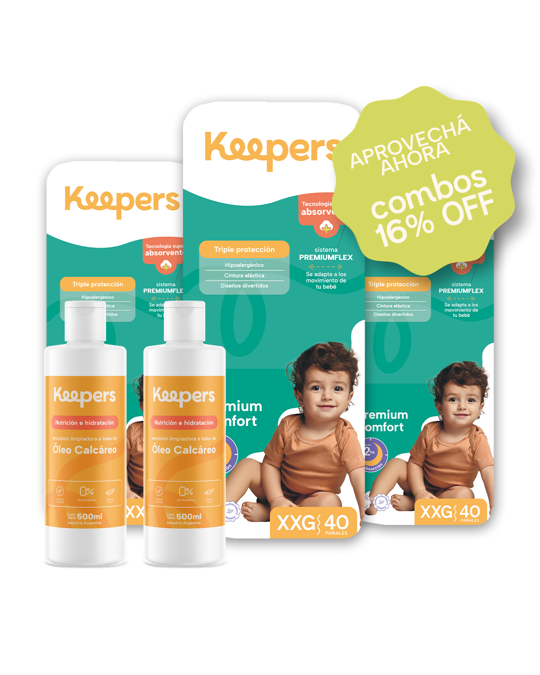 Súper Combo Mensual de 120 pañales Talle XXG + 2 Óleos Calcáreos Premium