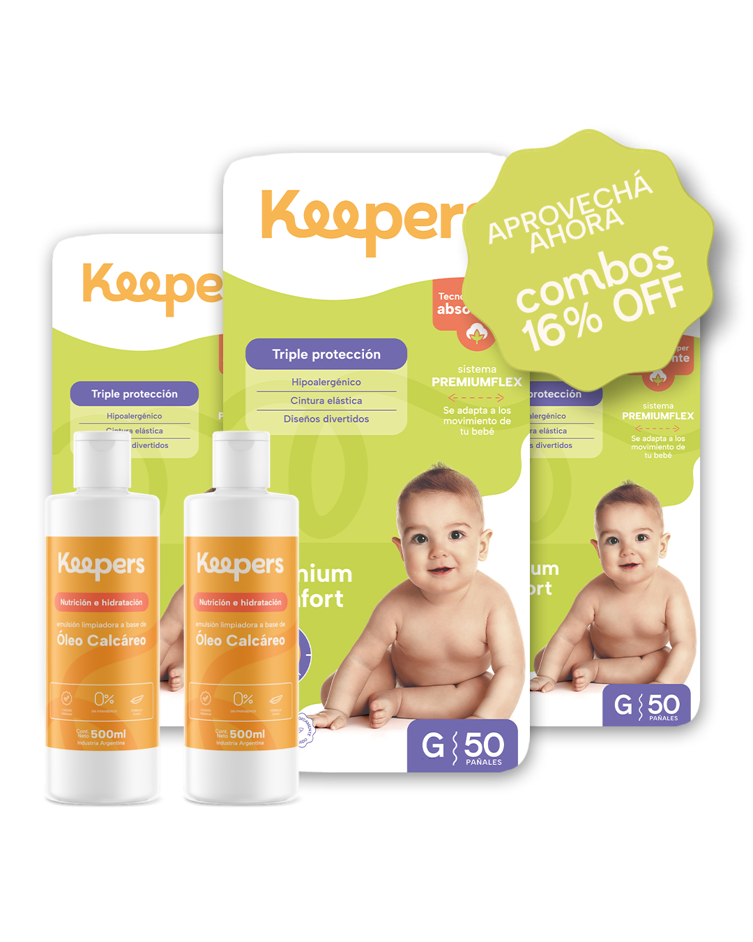 Súper Combo Mensual de 150 pañales Talle G + 2 Óleos Calcáreos Premium